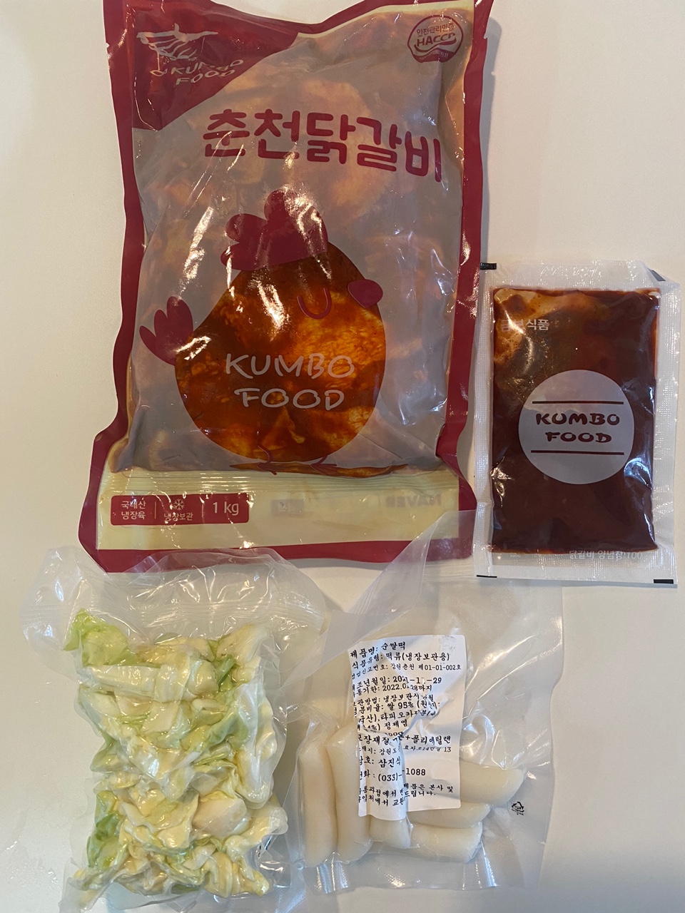 기본 구성 1kg 닭과 야채, 떡, 여분의 양념장으로 구성되어 있다. (추가 양념장은 볶음밥, 사리 추가시 유용)