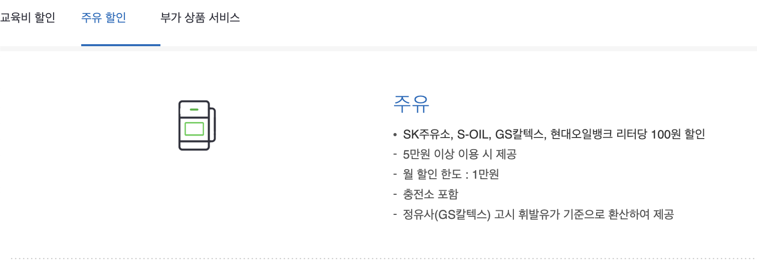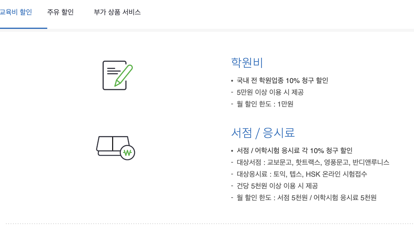 교육비 / 주유 / 통신요금 할인이 가능하다.