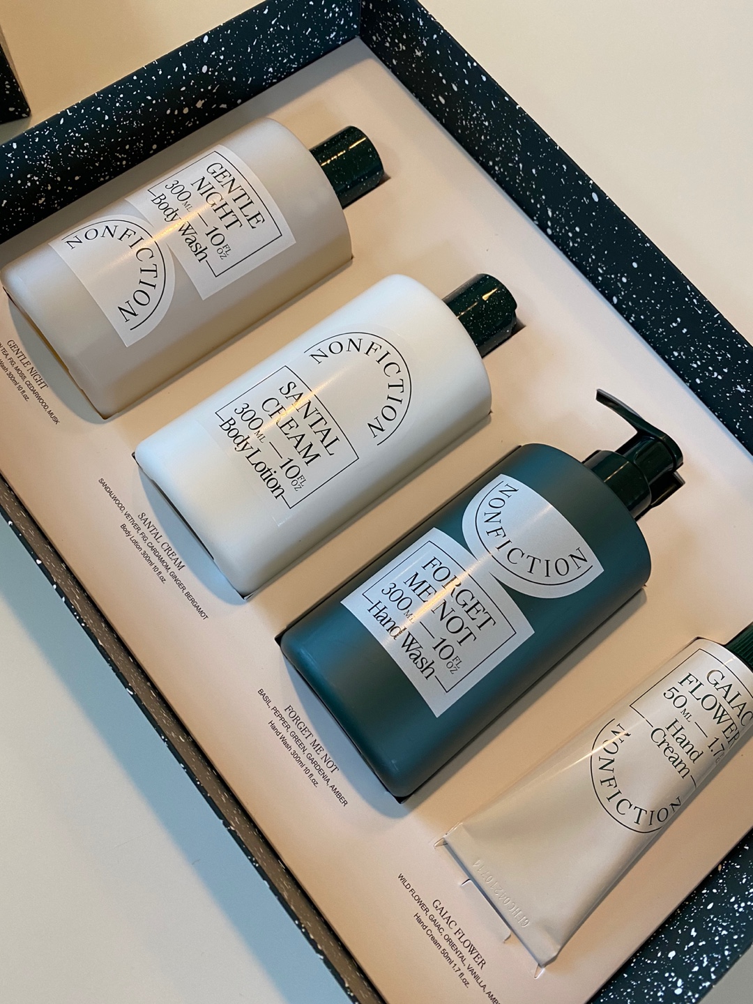 내용물은 젠틀나잇 바디워시, 상탈크림, 포켓미낫 핸드워시, 핸드크림이 들어 있었다.