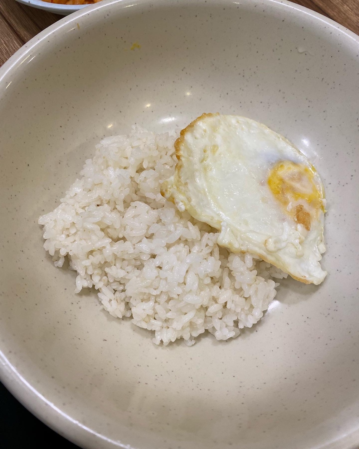 밥에는 계란후라이가 하나 올려서 나왔고, 밥은 셀프로 추가로 먹을 수 있었다. 추가 계란후라이는 추가 요금을 내야 한다.