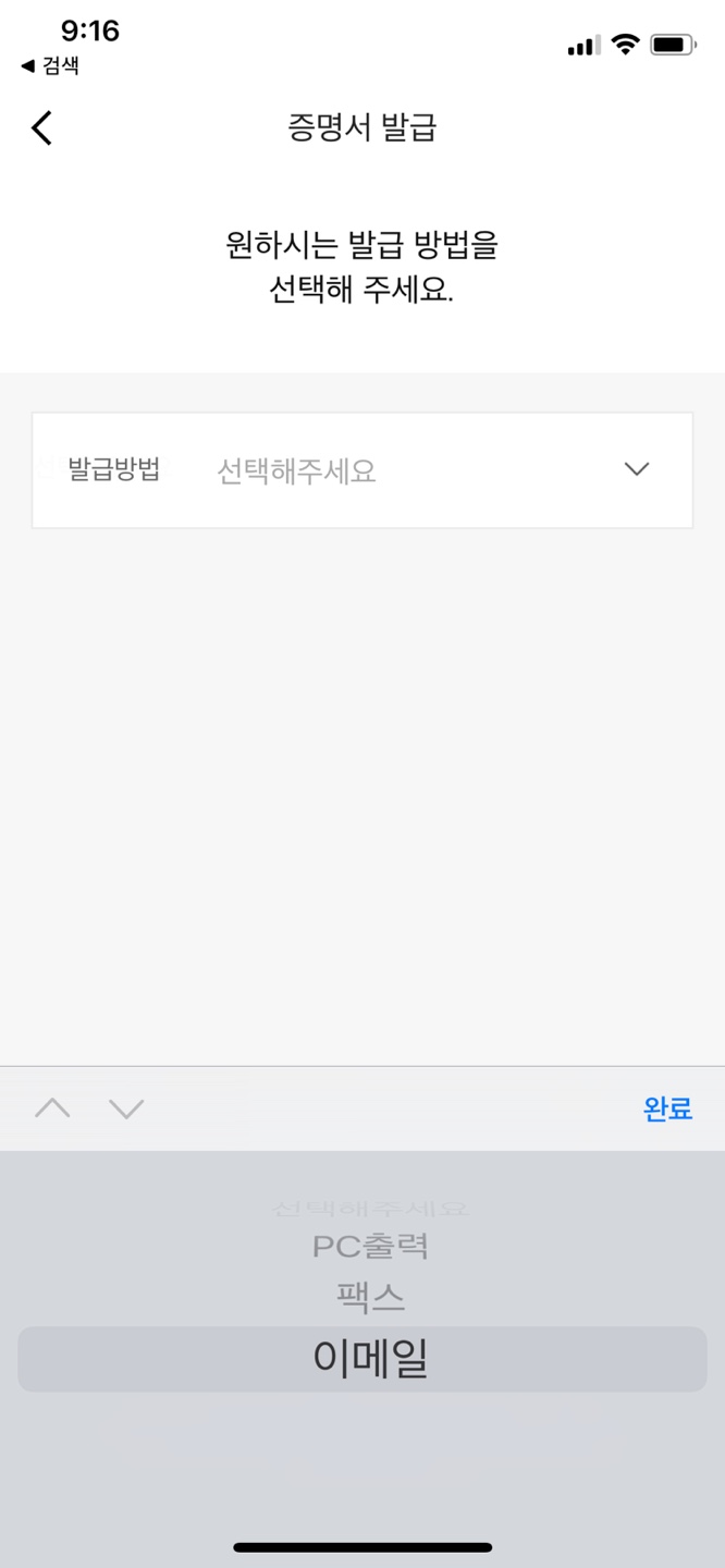 증명서 발급 방법은 PC출력, 팩스, 이메일을 선택할 수 있다.