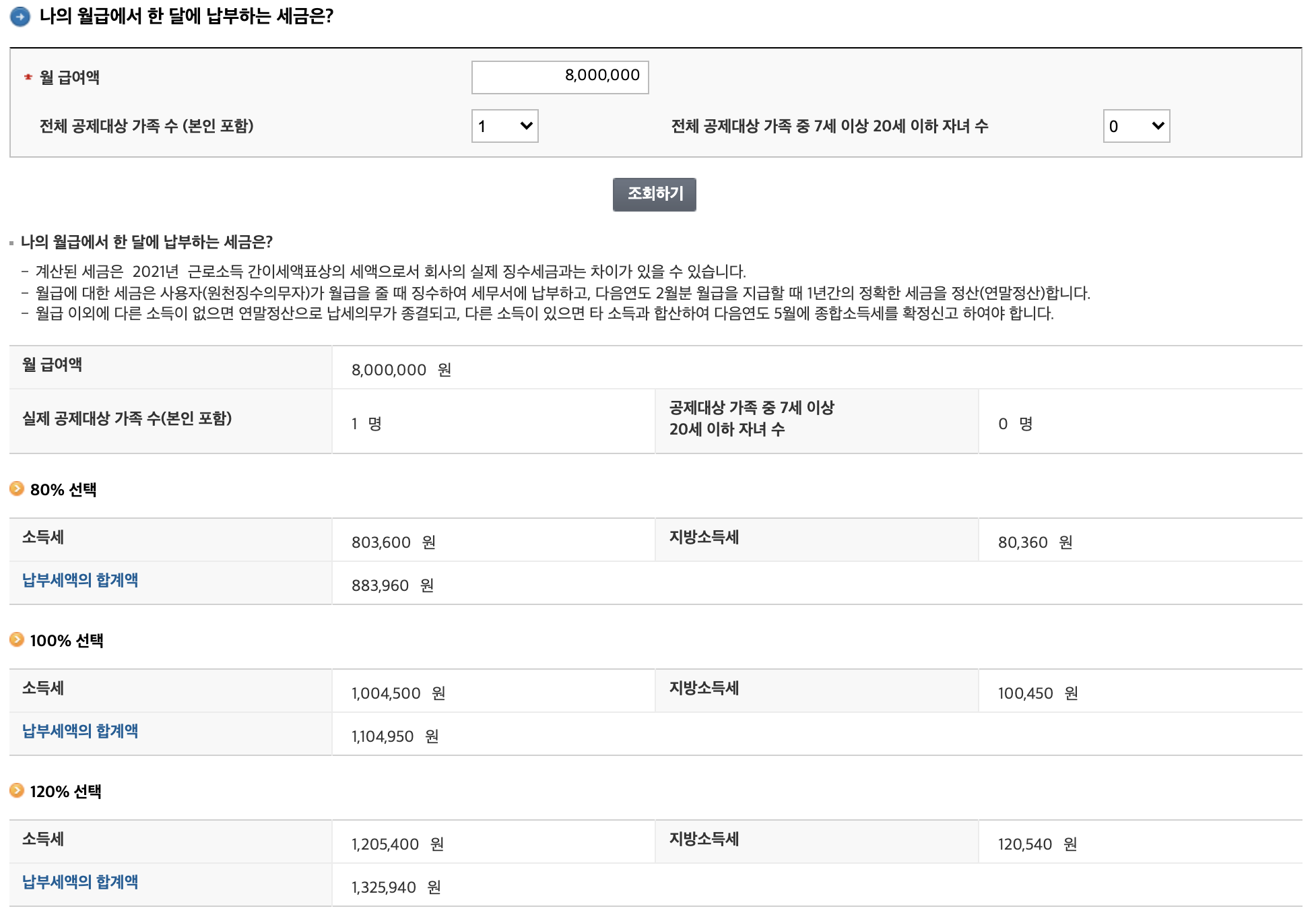 예를 들어 800만원 / 공제대상 인원 / 소득납부 비율에 따라 납부하는 세금을 확인 할 수 있다.