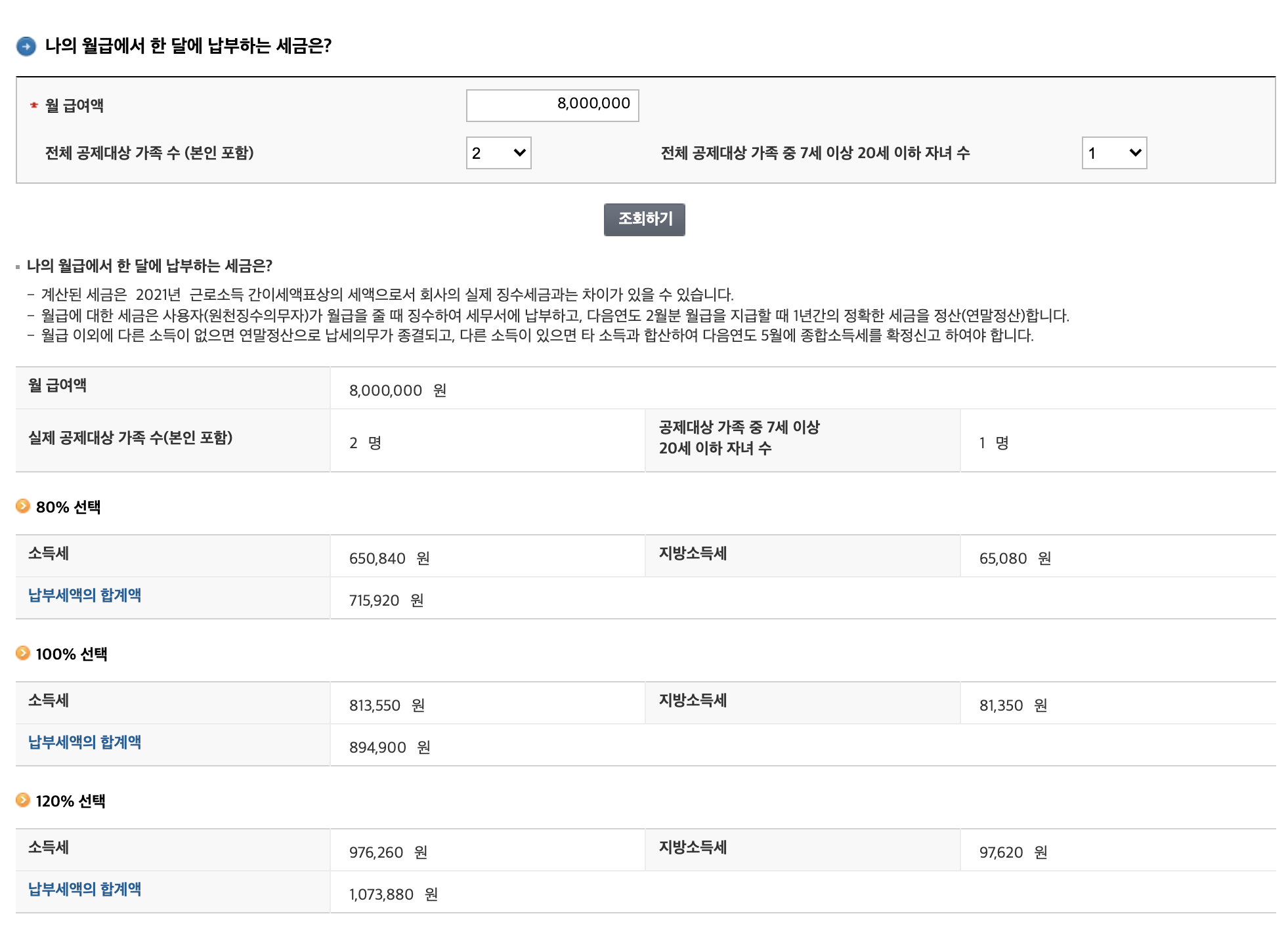 예를 들어 800만원 / 공제대상 인원 / 소득납부 비율에 따라 납부하는 세금을 확인 할 수 있다.