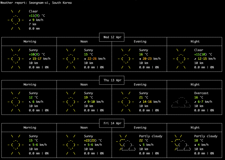 curl 로 날씨 확인하기 재미난거2023. 4. 12. 19:52 728x90 맥북 혹은 리눅스 콘솔상에서 날씨를 손쉽게 확인하는 방법이 있다. curl wttr.in curl wttr.in/Seoul https://github.com/chubin/wttr.in 728x90 공유하기 게시글 관리 CODEZIP.NET